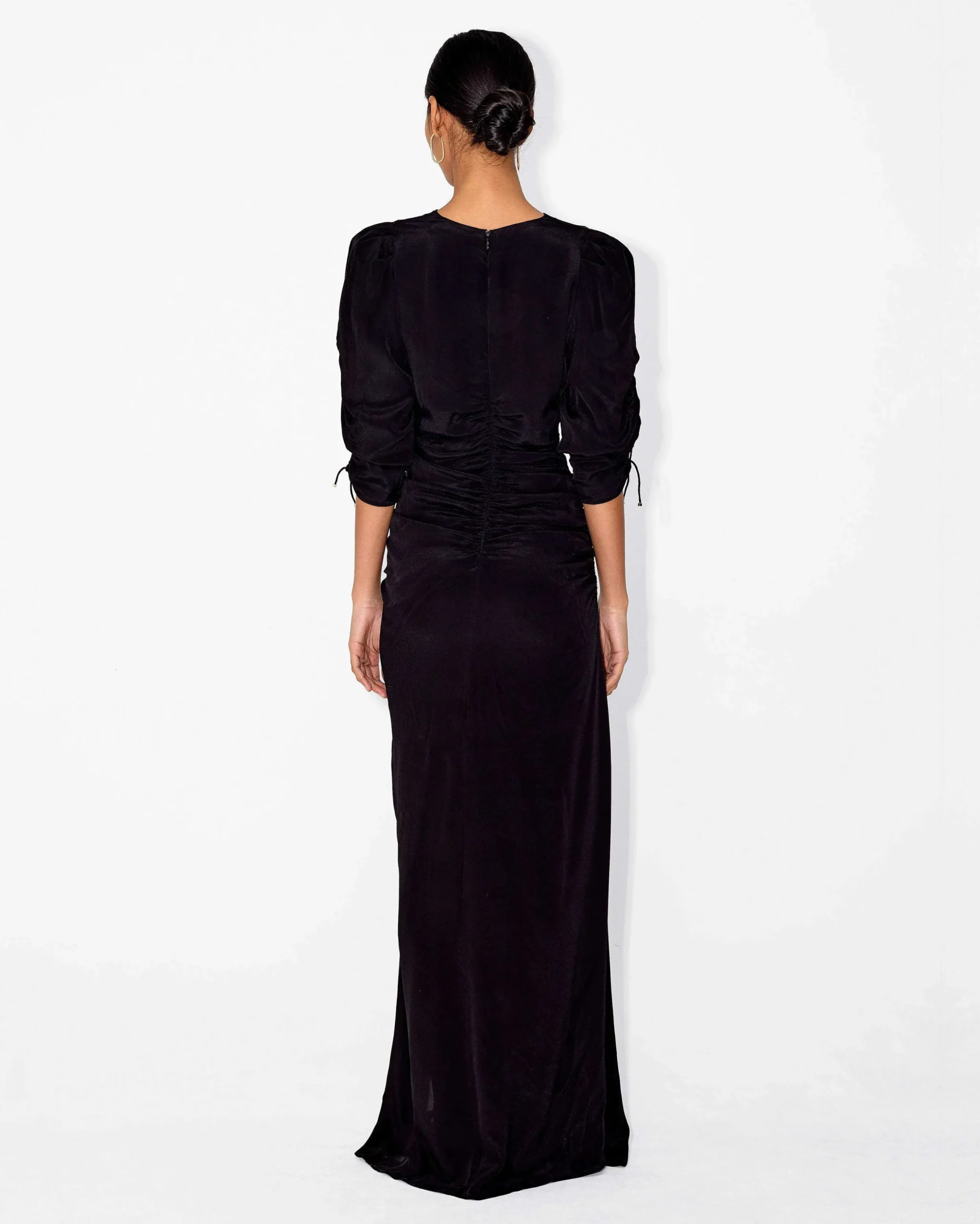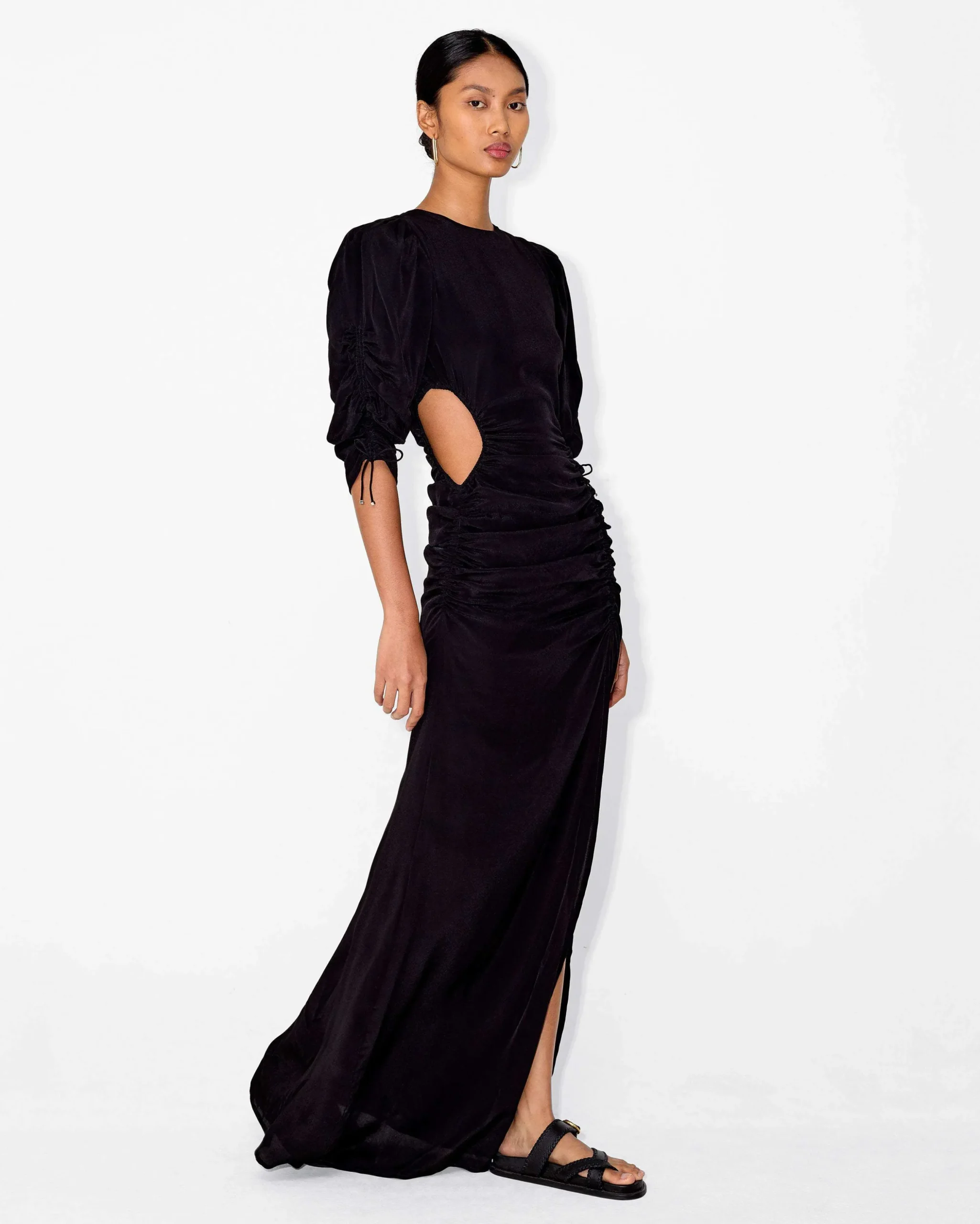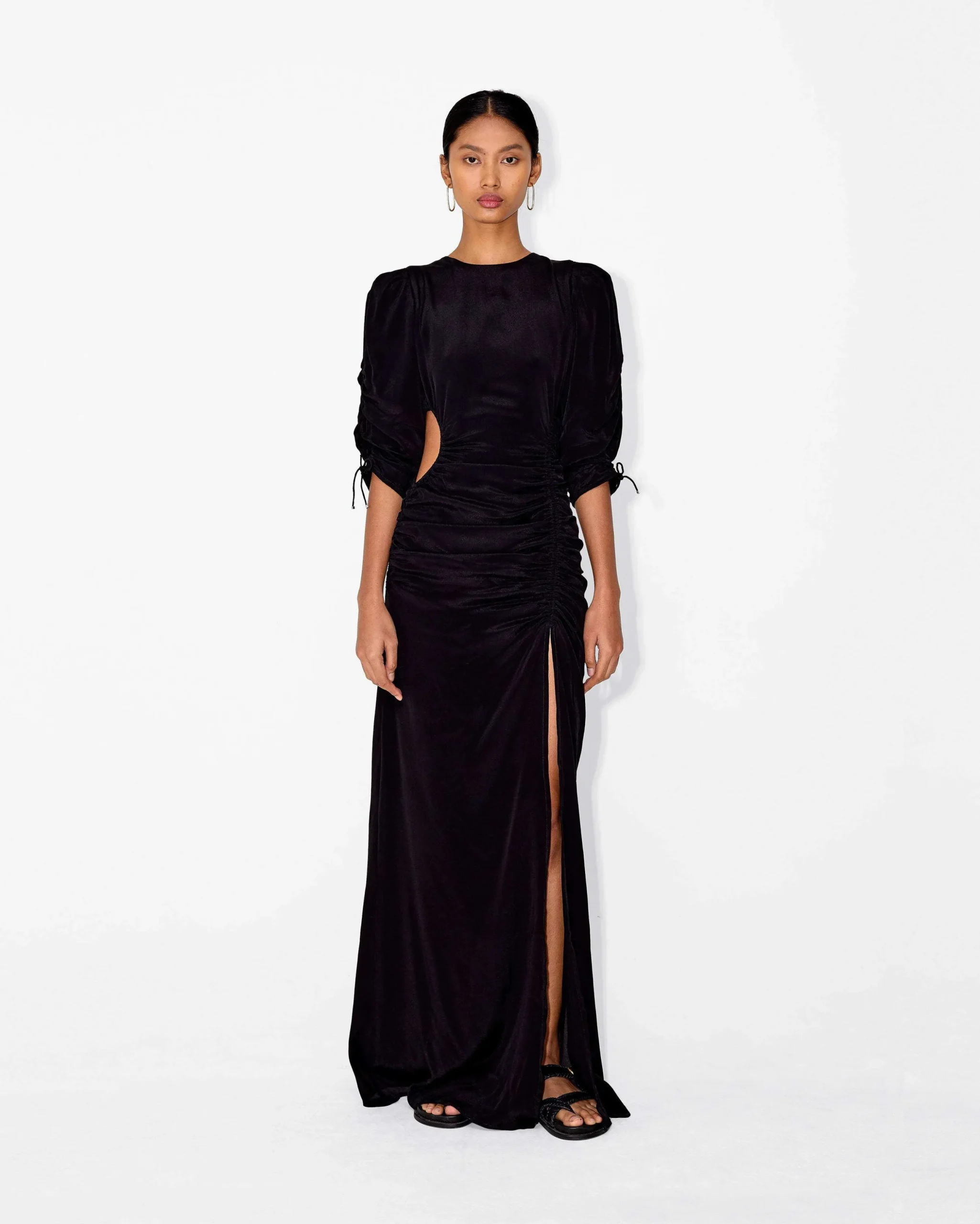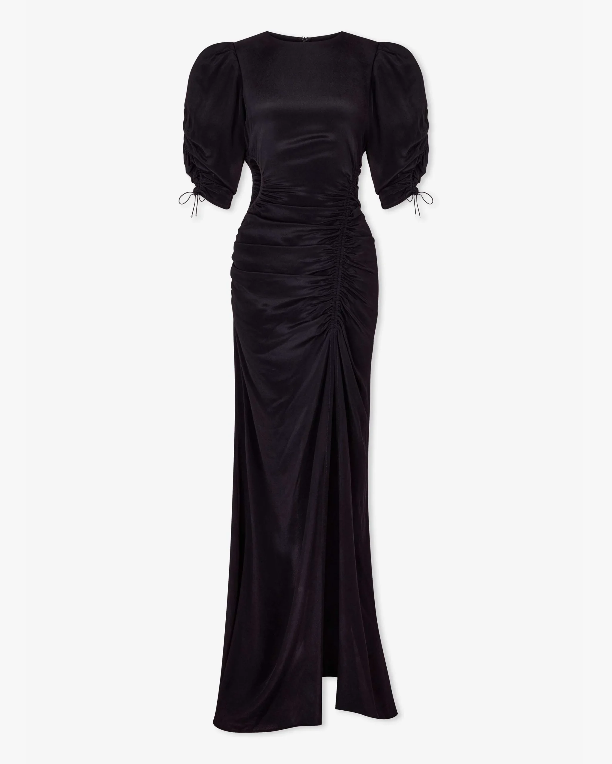 The Honore Dress comes in a signature floral print and in a plain black. The maxi length dress features a side cut-out, balloon shoulders, and a dramatic high-cut split. Wear this dress for any special occasion and style it with Magali Pascal jewellery to create a full look.