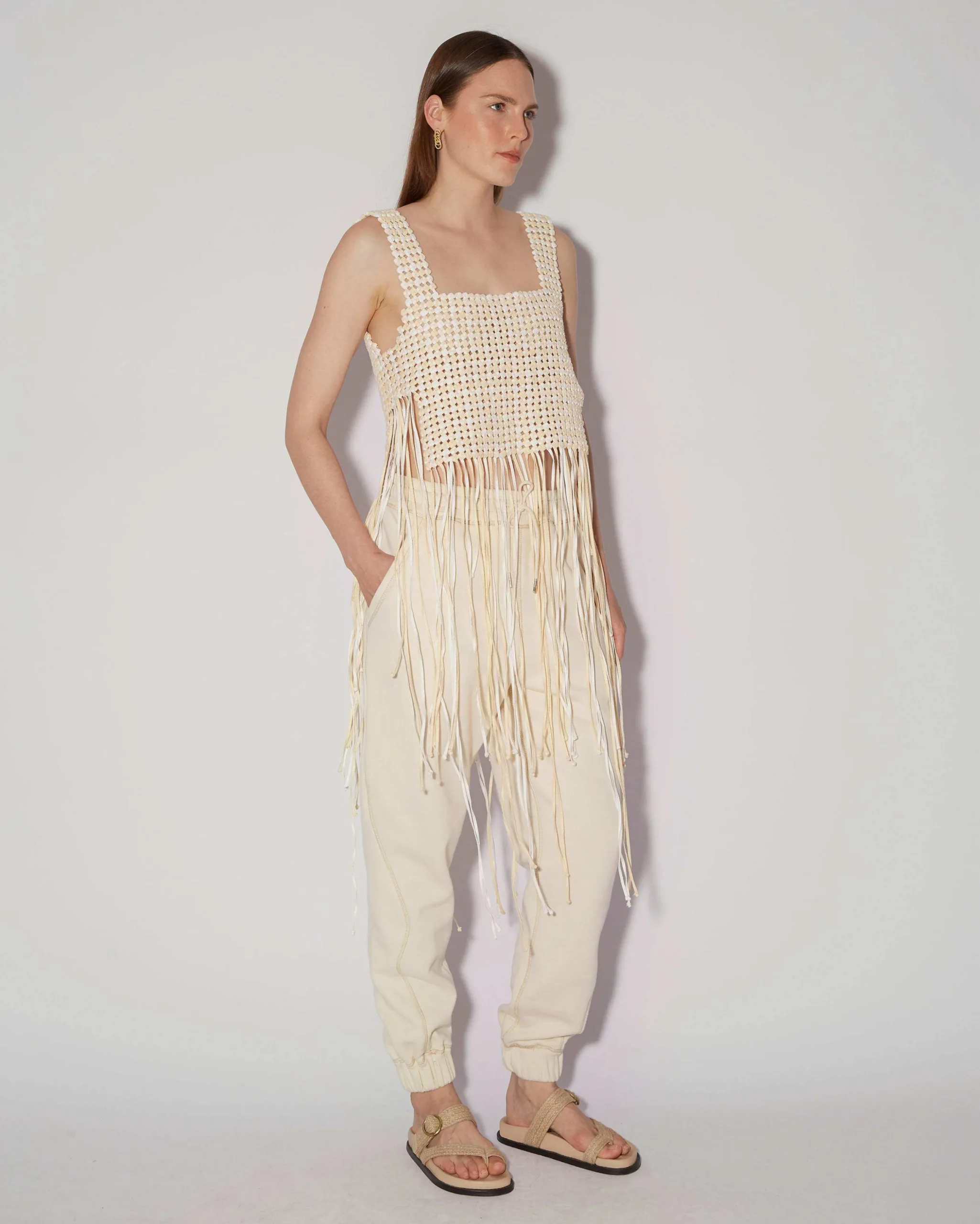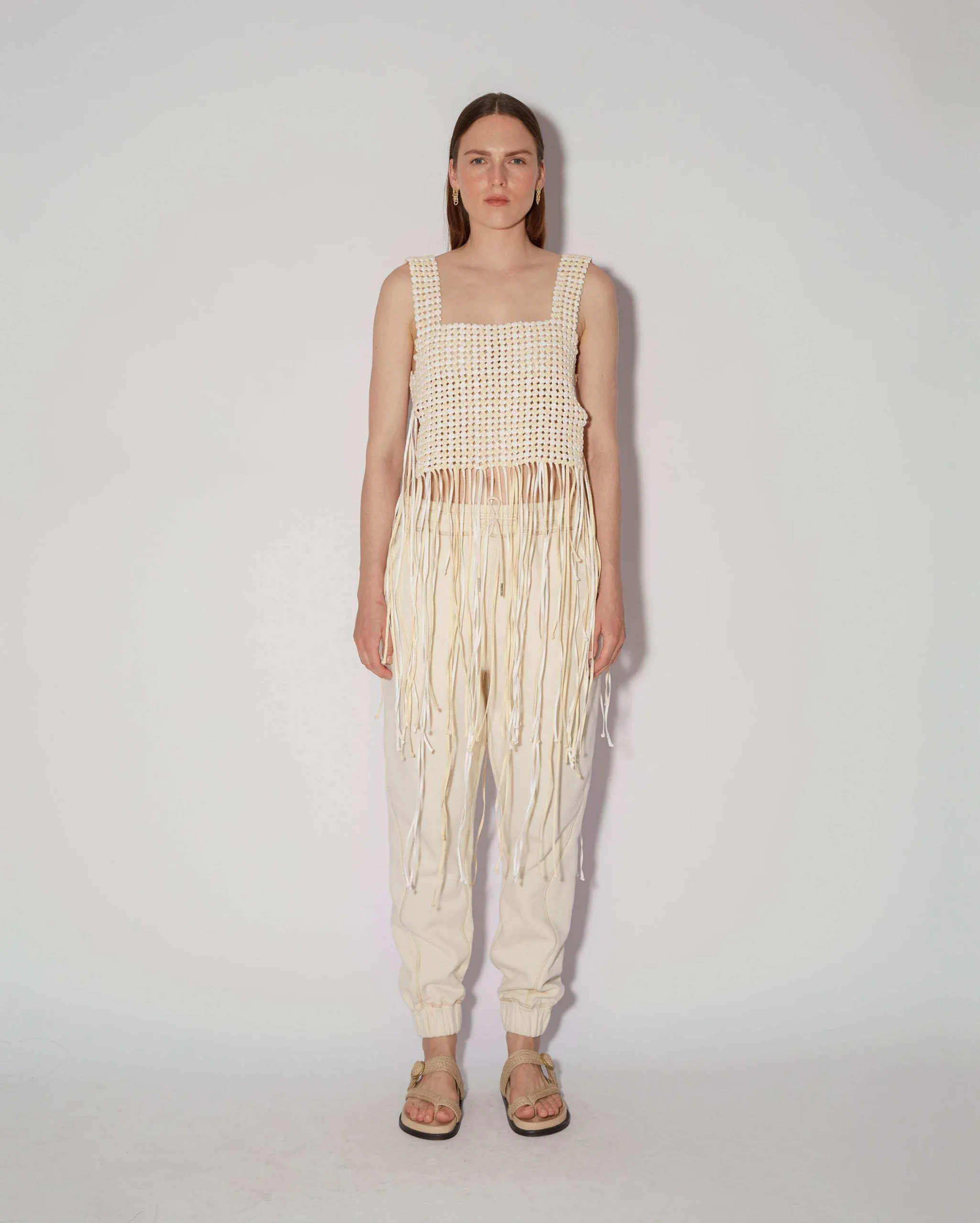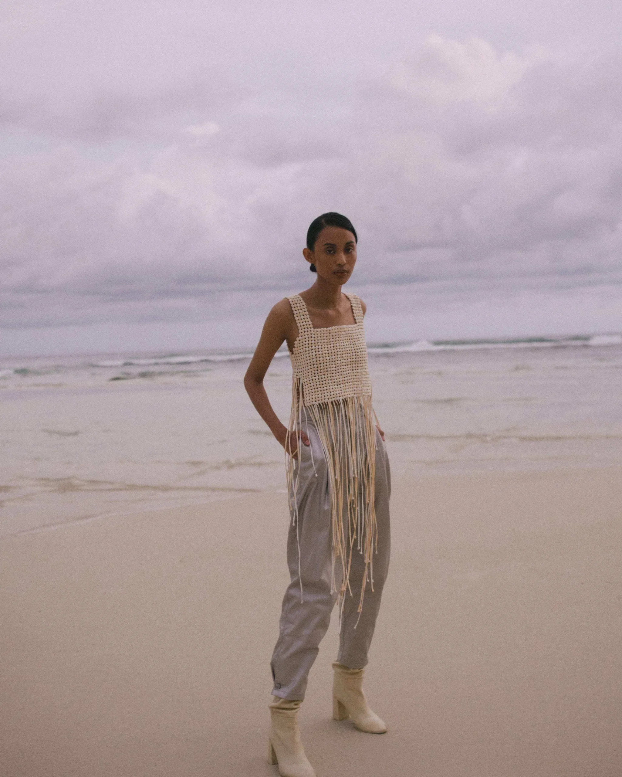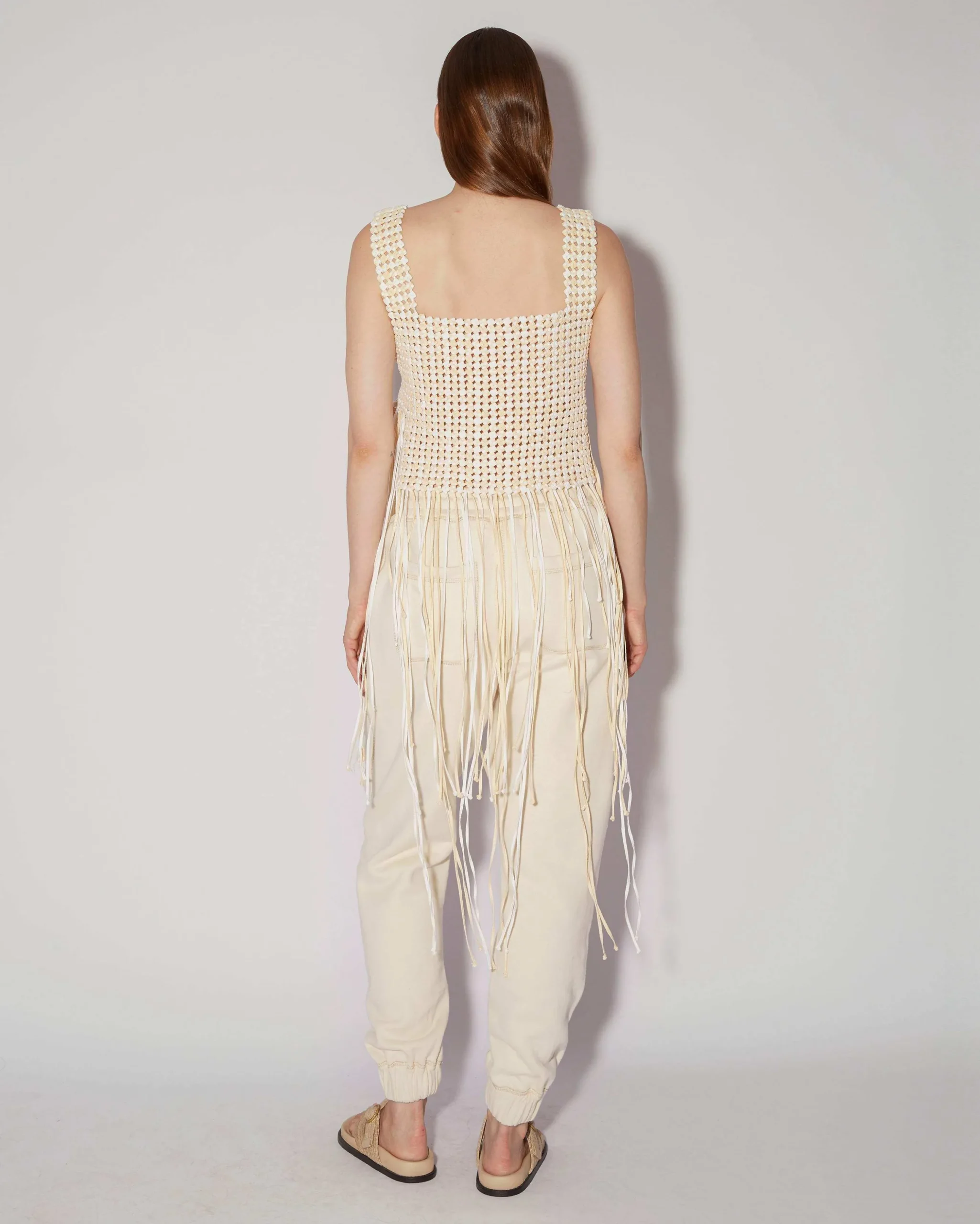 The Mano Top is Magali’s interpretation of the traditional macramé technique, blending artisan craftsmanship with elevated designs. This top uses the same braiding technique, and each cotton string is used to its entirety making it a zero-waste piece. The boxy shape features wide shoulder straps and a square collar.