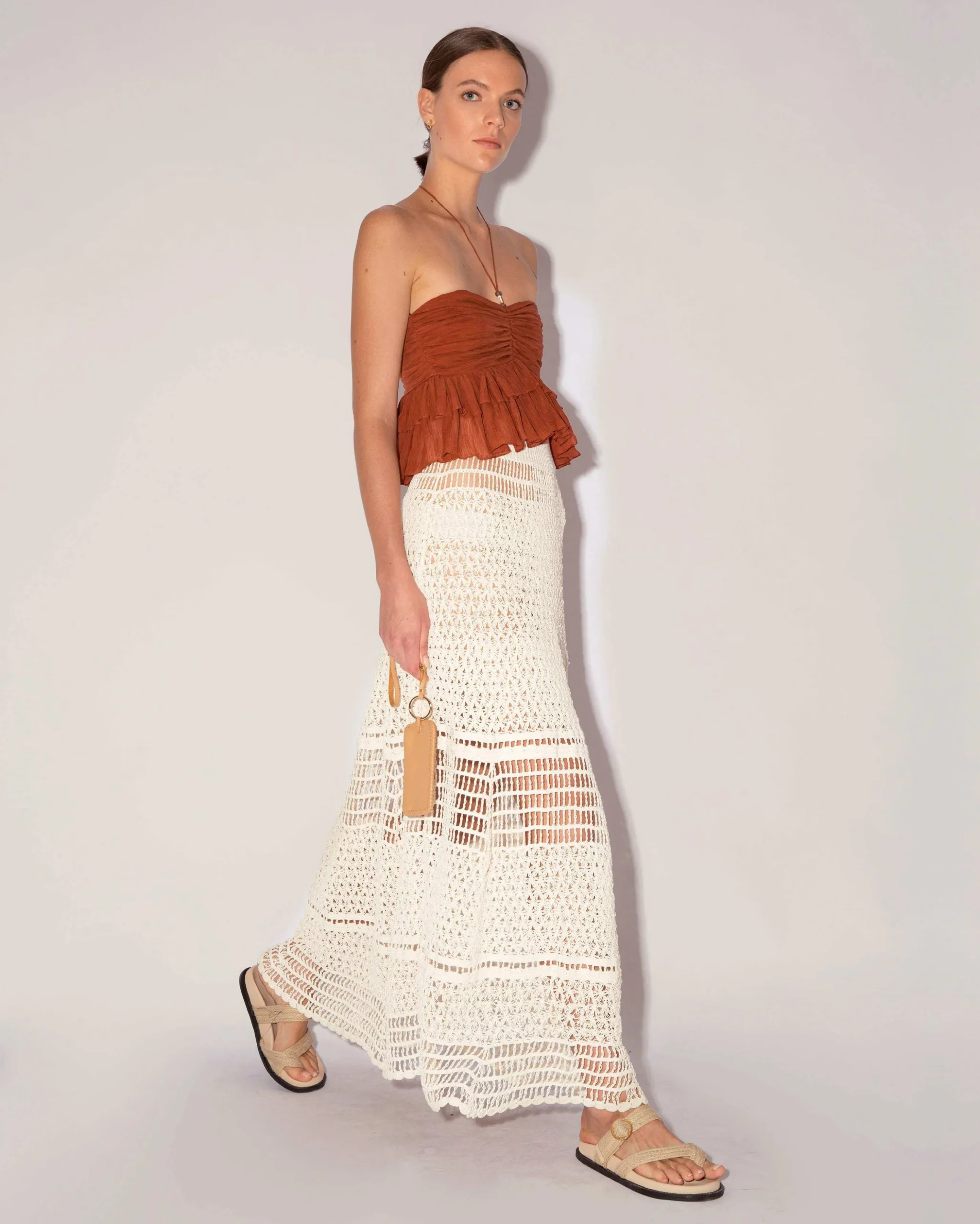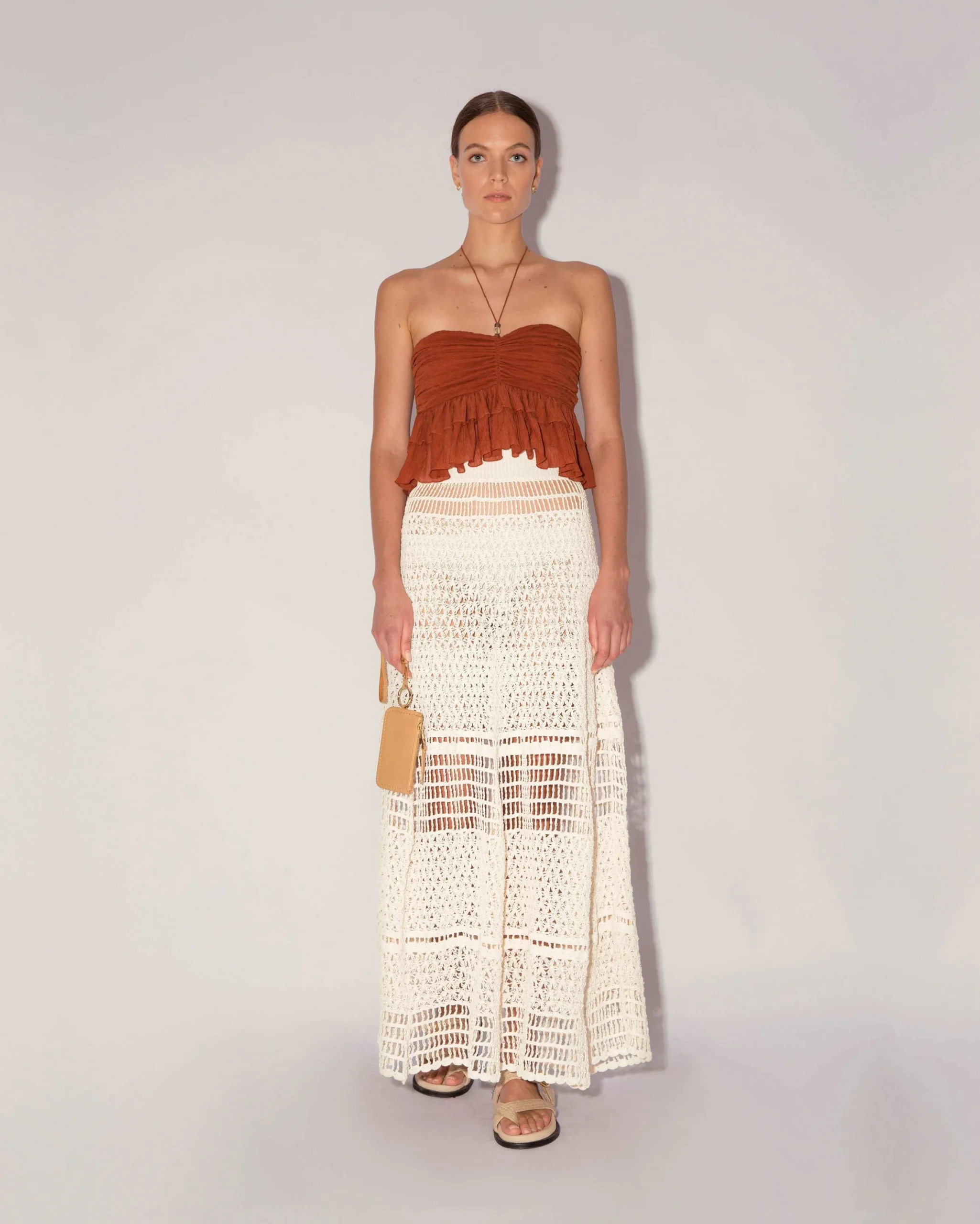 The Shellee Top is crafted from cupro crinke and features a halter-neck design and a cropped fit. The top is finished with glass beads and is gathered below the bust to create feminine volume.