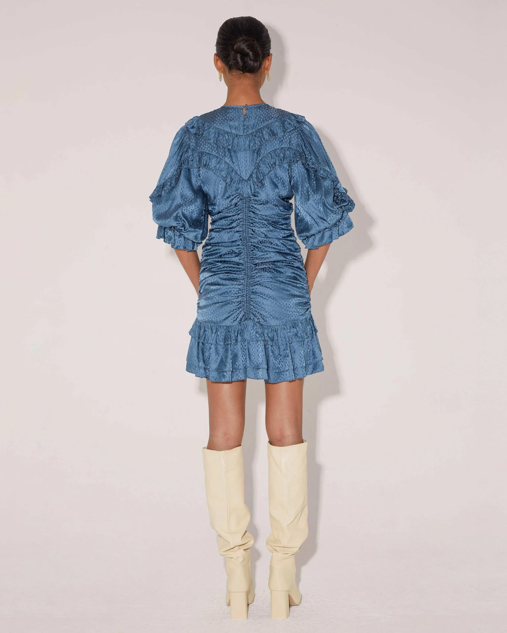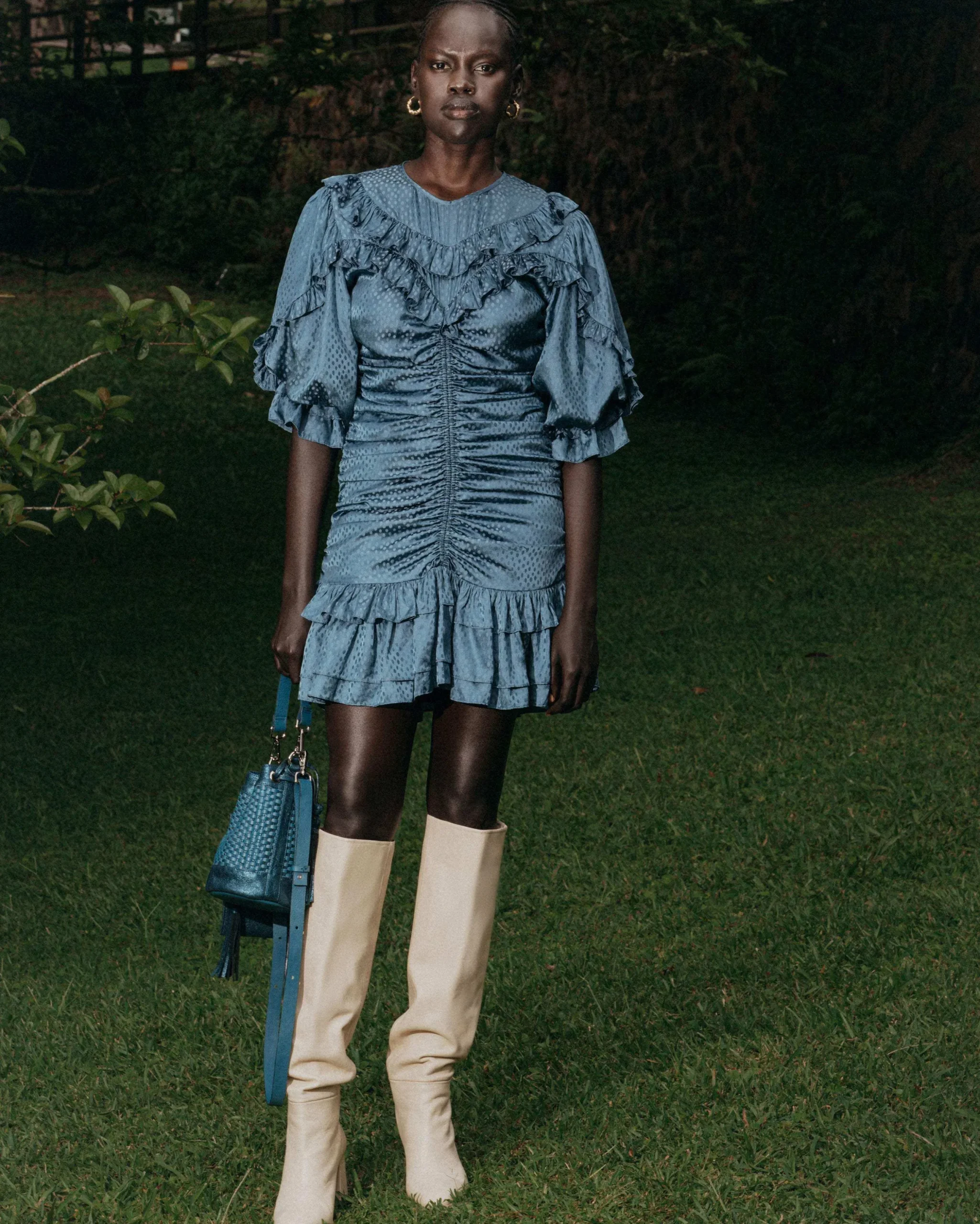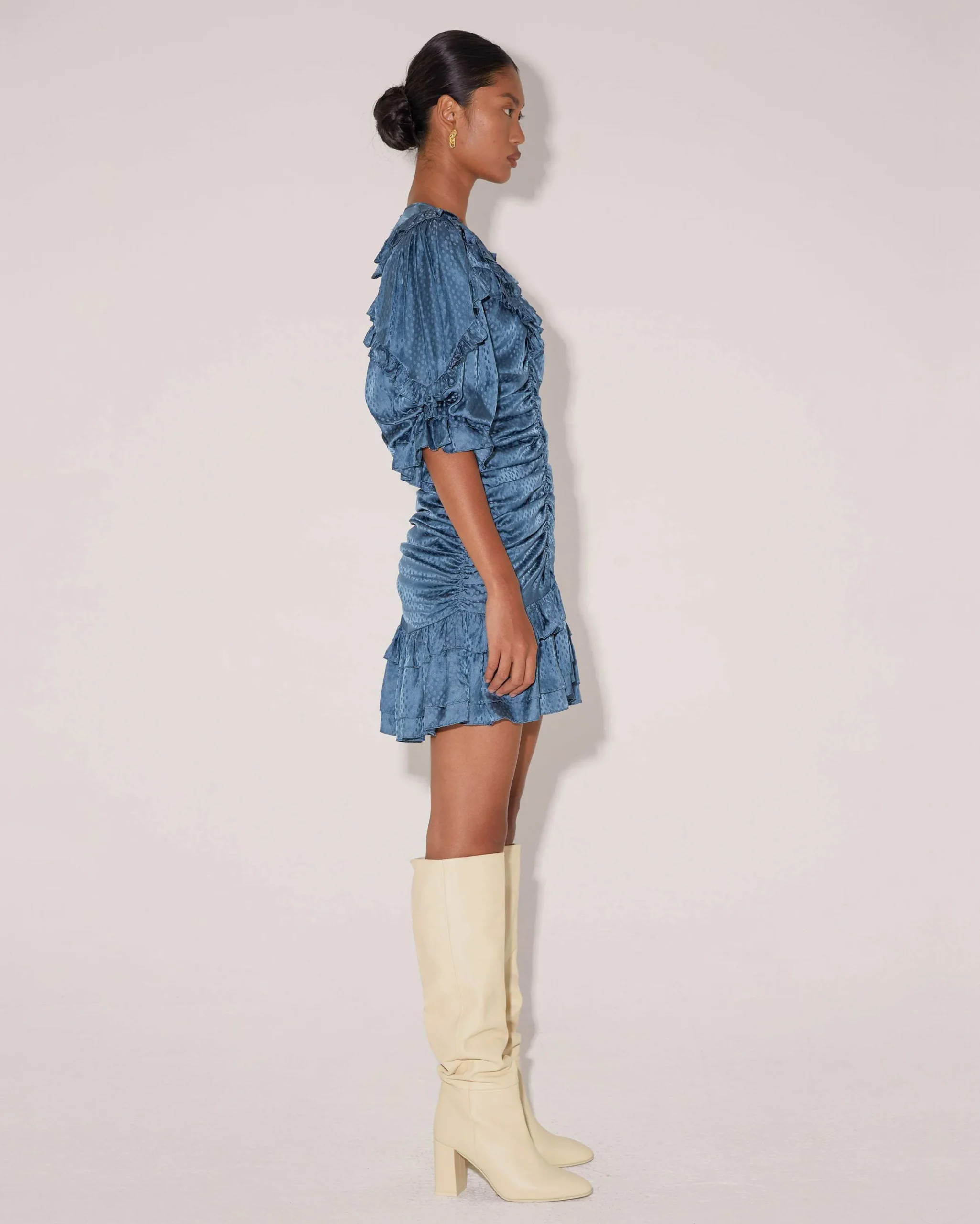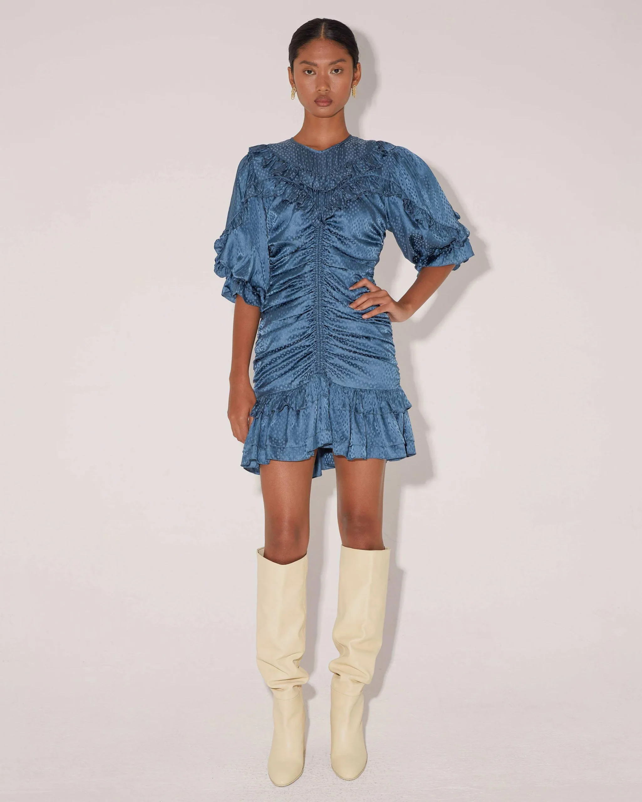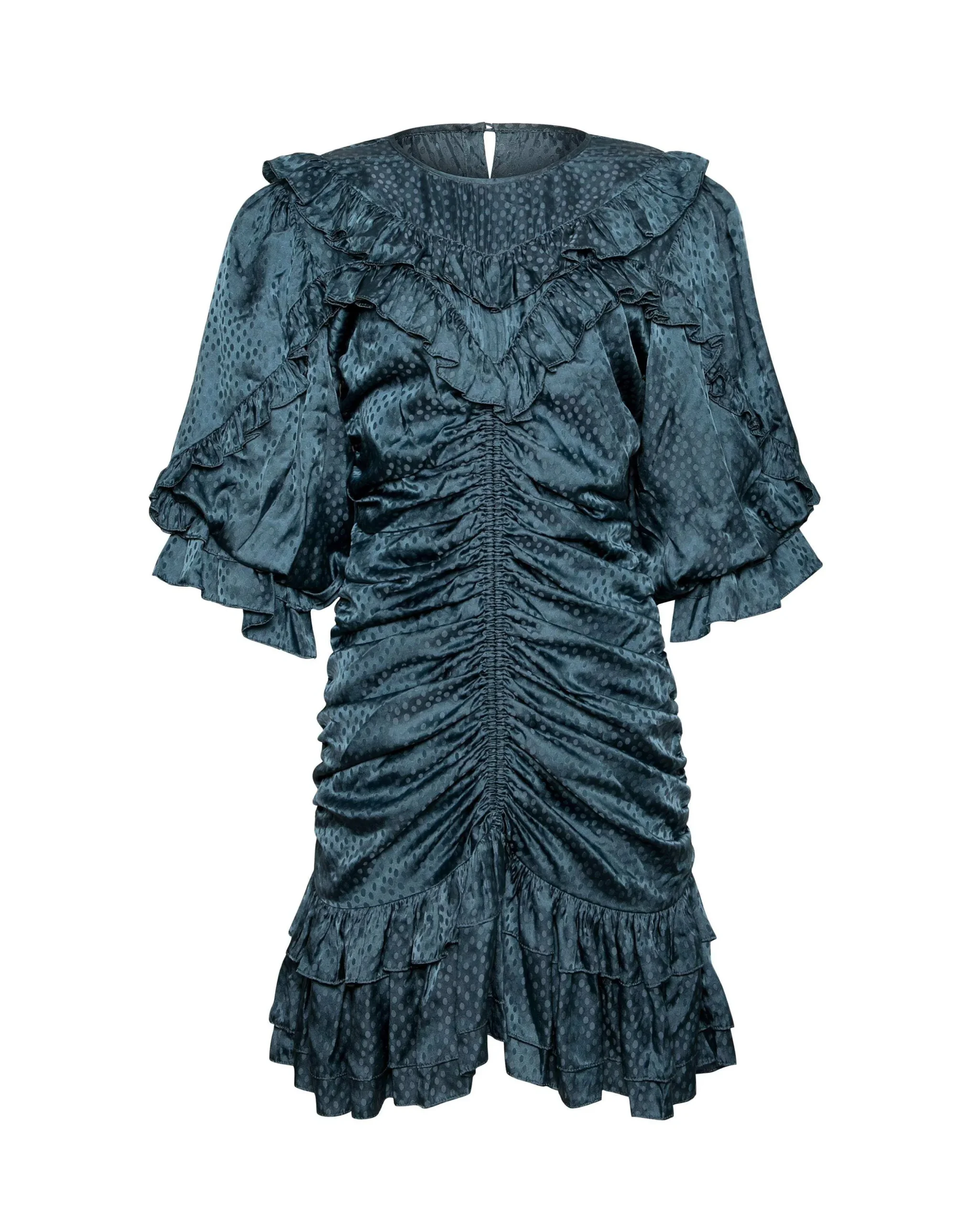 Crafted from a luxurious Silk Viscose Jacquard with subtle dot detailing, the Tiffin Dress is designed as the ultimate party look. The dress features voluminous elbow length sleeves with ruffle detailing that extends across the front chest panel. The body hugging dress has an elasticated middle hemline that creates a unique pleating effect.